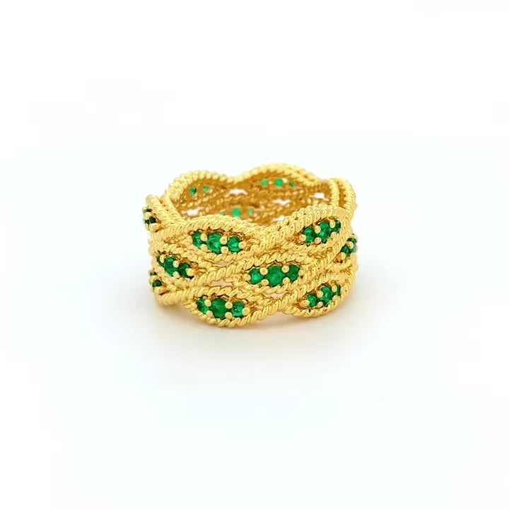 The "Twilight Vine" ring celebrates the beauty of intertwined connections. Crafted in 18k gold, its braided design exudes timeless sophistication, while vibrant emeralds add a touch of bold elegance. The intricate detailing reflects the harmony of nature’s graceful forms, brought to life through masterful craftsmanship.